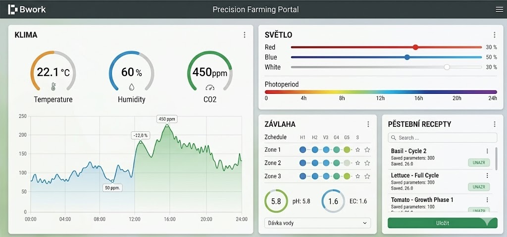 - Absolutní kontrolu nad klimatem: Automatizované řízení teploty, vlhkosti a CO2. Eliminujeme rizika a lidské chyby.